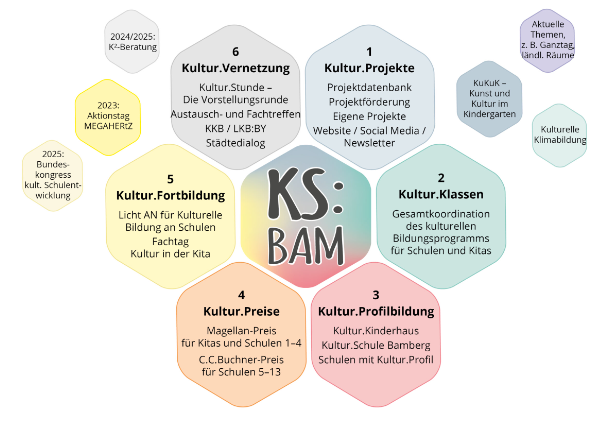 Der KS:BAM ist eine kommunale Koordinierungsstelle für Kulturelle Bildung, die von Stadt und Landkreis Bamberg gemeinsam getragen wird, angesiedelt im städtischen Kulturamt. Als Serviceeinrichtung unterstützen wir Schulen, Kitas und Kulturakteur:innen bei der Umsetzung kultureller Bildungsangebote für Kinder, Jugendliche und junge Erwachsene. Im Mittelpunkt steht die Persönlichkeitsbildung durch kreativ-künstlerische Ausdrucksformen und spielerische Zugänge.